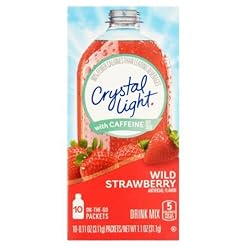 Introducing Crystal Light Wild Strawberry with Caffeine Drink Mix On The Go, 10 Count (Pack of 3). This delicious and convenient drink mix is the perfect way to get your daily dose of caffeine and flavor. Each packet contains a blend of wild strawberry flavor and 50mg of caffeine, giving you the energy you need to power through your day.