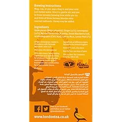 The London Tea Company 20 Enveloped Zingy Lemon and Ginger Infusion Bags 40 g (Pack of 6) is the perfect way to enjoy a refreshing and invigorating cup of tea. Our unique blend of zesty lemon and spicy ginger is sure to tantalize your taste buds and leave you feeling energized and revitalized.