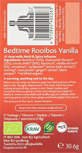 Yogi Teas Ayurvedic Organic Bedtime Rooibos Vanilla 17bags (PACK OF 1) is the perfect way to end your day. This delicious blend of organic rooibos, vanilla, and other Ayurvedic herbs is designed to help you relax and unwind. The unique combination of herbs helps to soothe the mind and body, allowing you to drift off into a peaceful sleep.